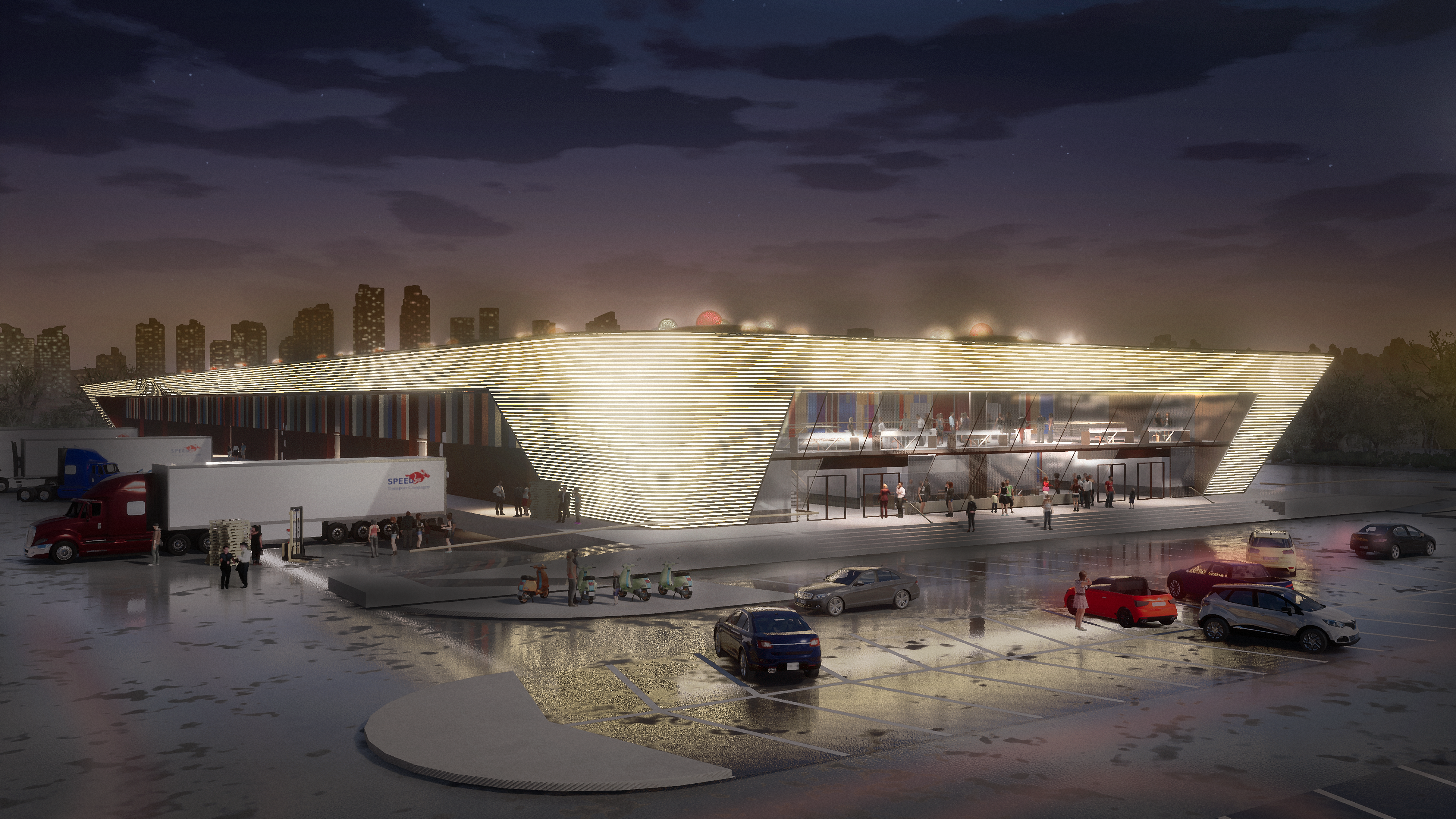 Over network of streets and selling areas, there is a light and modular cover, a slightly curved plane, whose exterior reference is inspired by the undulating shells of the molluscs, and whose interior generates a commercial space of marine references.